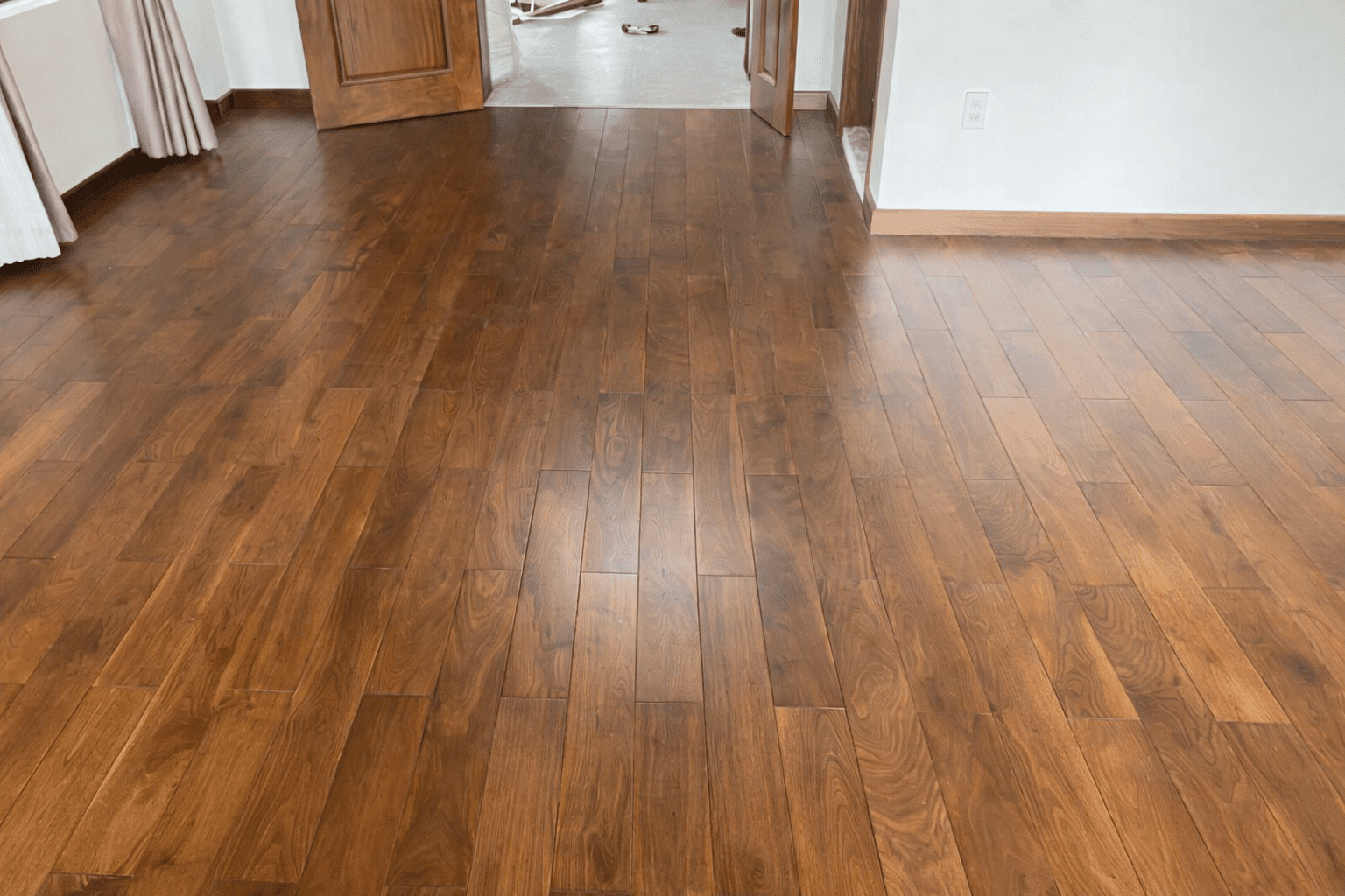 Sàn gỗ Óc Chó Walnut sở hữu hệ vân gỗ cuộn xoáy, uốn lượn tự nhiên, mỗi tấm ván là một hoa văn khác biệt, không trùng lặp. Màu nâu trầm sang trọng mang đến cảm giác ấm cúng, lịch lãm, rất phù hợp với không gian phòng khách, phòng ngủ master và phòng làm việc cao cấp.